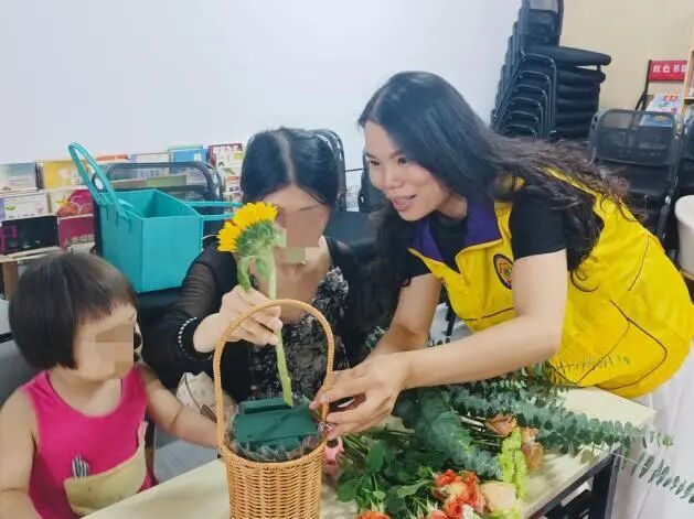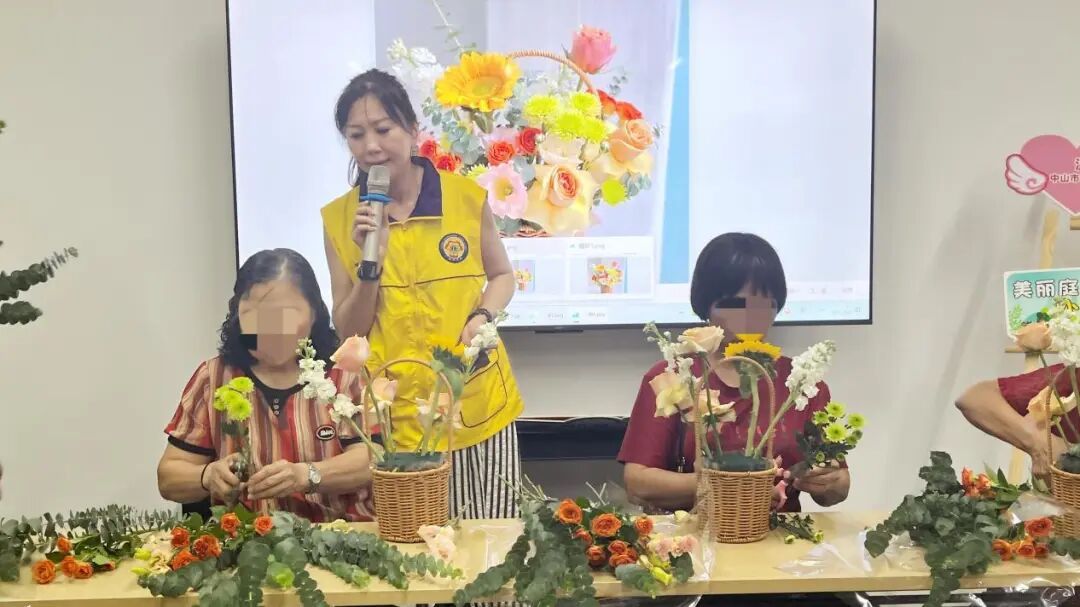 活动伊始,广东狮子会雅媛服务队会员关爱工作长刘焯雅为参与者详细讲解花艺知识。她不仅介绍了本次所用花材的品种、寓意及搭配技巧,清晰梳理从主花到配叶的选择逻辑,为大家后续的创作筑牢基础;还针对不同花材的特性,分享剪根、换水、保鲜等实用养护方法,助力参与者延长花材观赏期,将花艺之美延续更久。